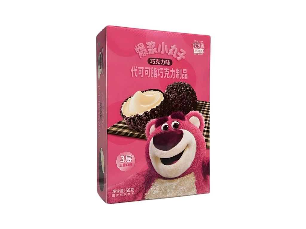 Křupavé kuličky s krémovou náplní, v dárkovém balení s motivem Lotso (Toy Story). Binqi & Disney Lotso čokoládové kuličky s čokoládovou náplní