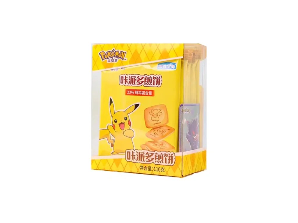 Pšeničné chutné malé palačinky s tvarem různých pokémonů. Obsahuje náhodnou nálepku Pokémon. Balení obsahuje 8 kusů Palačinkových sušenek