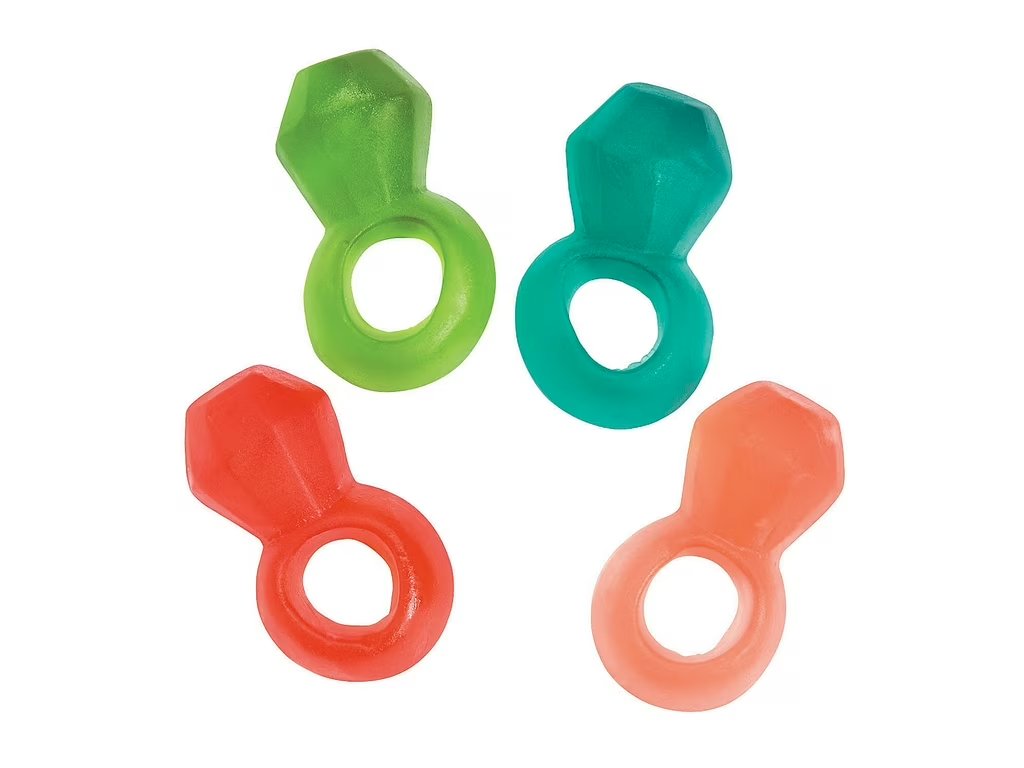Prstýnkové bonbonky ve tvaru diamantu, gumové.